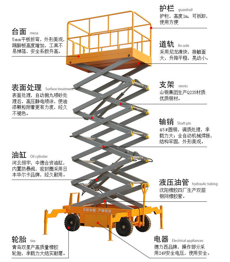 移動剪叉升降機(jī)是用途廣泛的高空作業(yè)專用設(shè)備。它的剪叉機(jī)械結(jié)構(gòu),使升降臺起升有較高的穩(wěn)定性,寬大的作業(yè)平臺和較高的承載能力,使高空作業(yè)范圍更大、并適合多人同時作業(yè)。升降動力分為220V或380V電源,柴油機(jī),或電瓶動力源,特殊環(huán)境也可采用防爆泵站及防爆電器。升高4—22米,載重0.3—3噸。采用意大利和國產(chǎn)液壓泵站,臺面使用防滑絕緣扣板,具有防滑,絕緣、安全,請放心使用。它使高空作業(yè)效率更高,安全更保障。